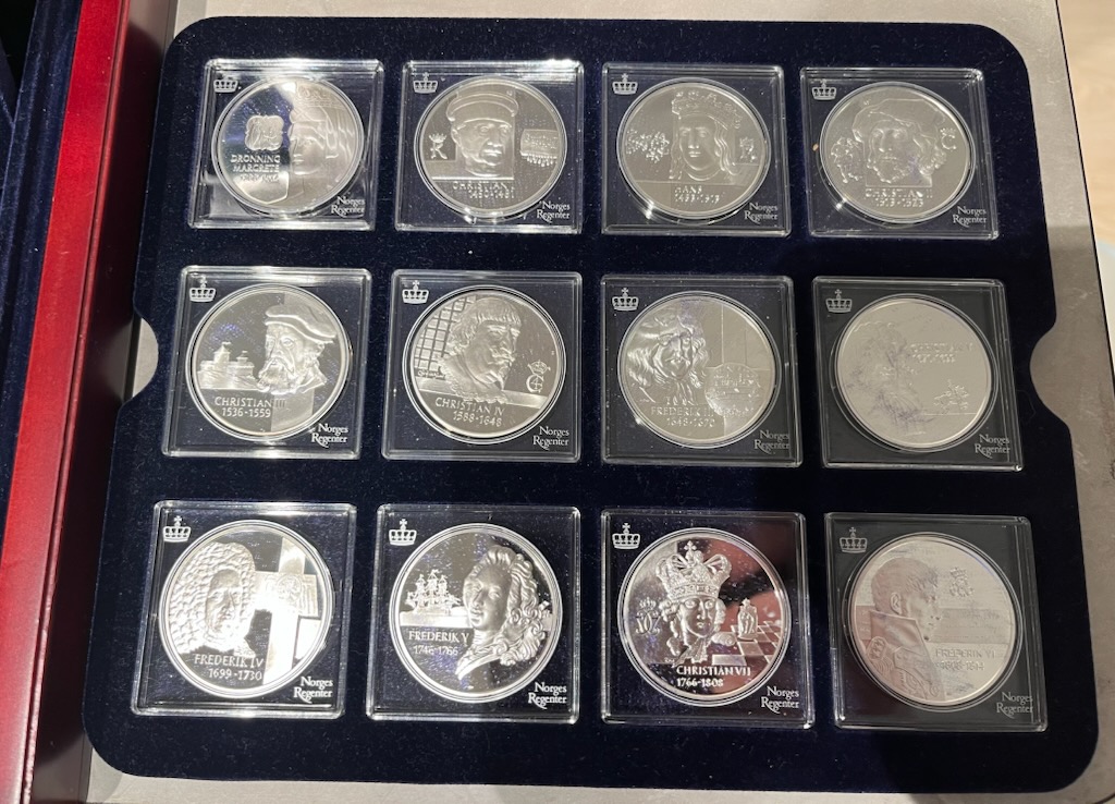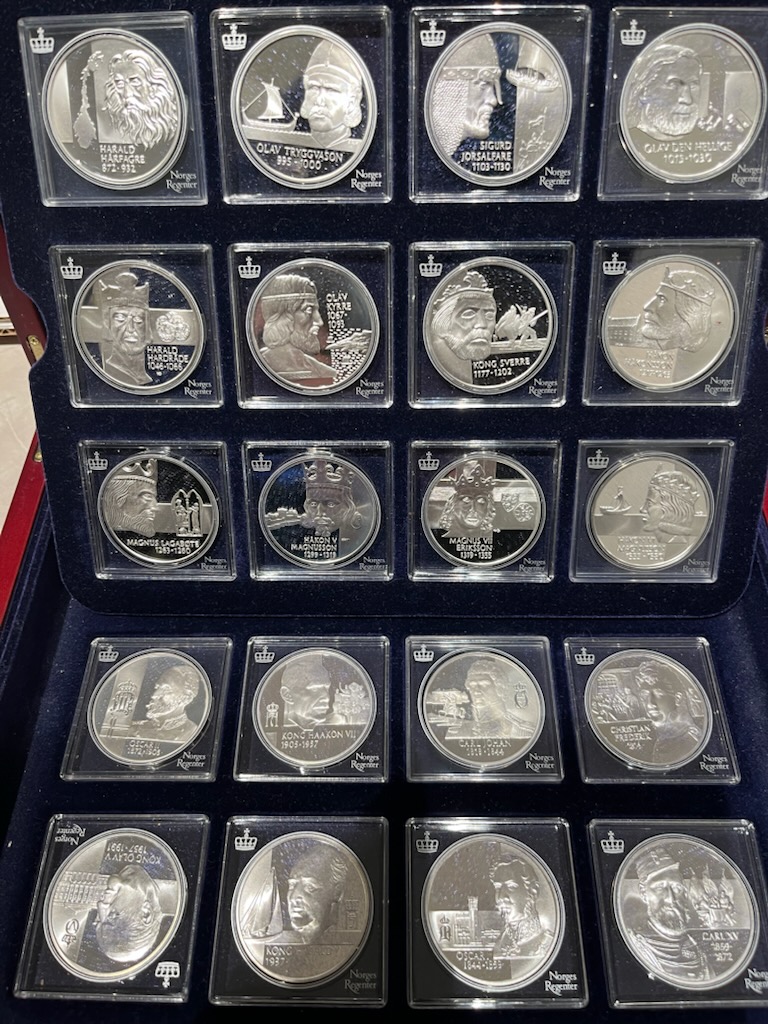 Norges Regenter - 32 medaljer i sølv. vekt pr. stk 33,9 gram. (925)(tot. 1014 gram rent sølv) Flott spennende serie med motiver fra norske regenter flere hundre år tilbake.