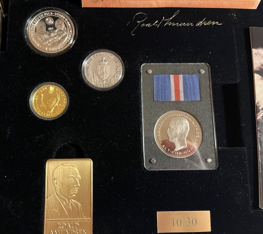 Jubileumssettet Roald Amundsen 150 år. Med gull og sølv.