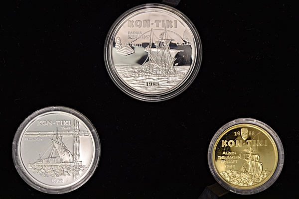 Kon-Tiki myntsett utgitt 1988 i 3.500 eksemplarer, med en gullmynt (7,5g/900), en 1 unse palladium-mynt og en 1 unse sølvmynt, til minne om Thor Heyerdahls Kon-Tiki ekspedisjon året 1947. Nr.1876 og signert på sertifikat. Palladium prisen bare øker og øker