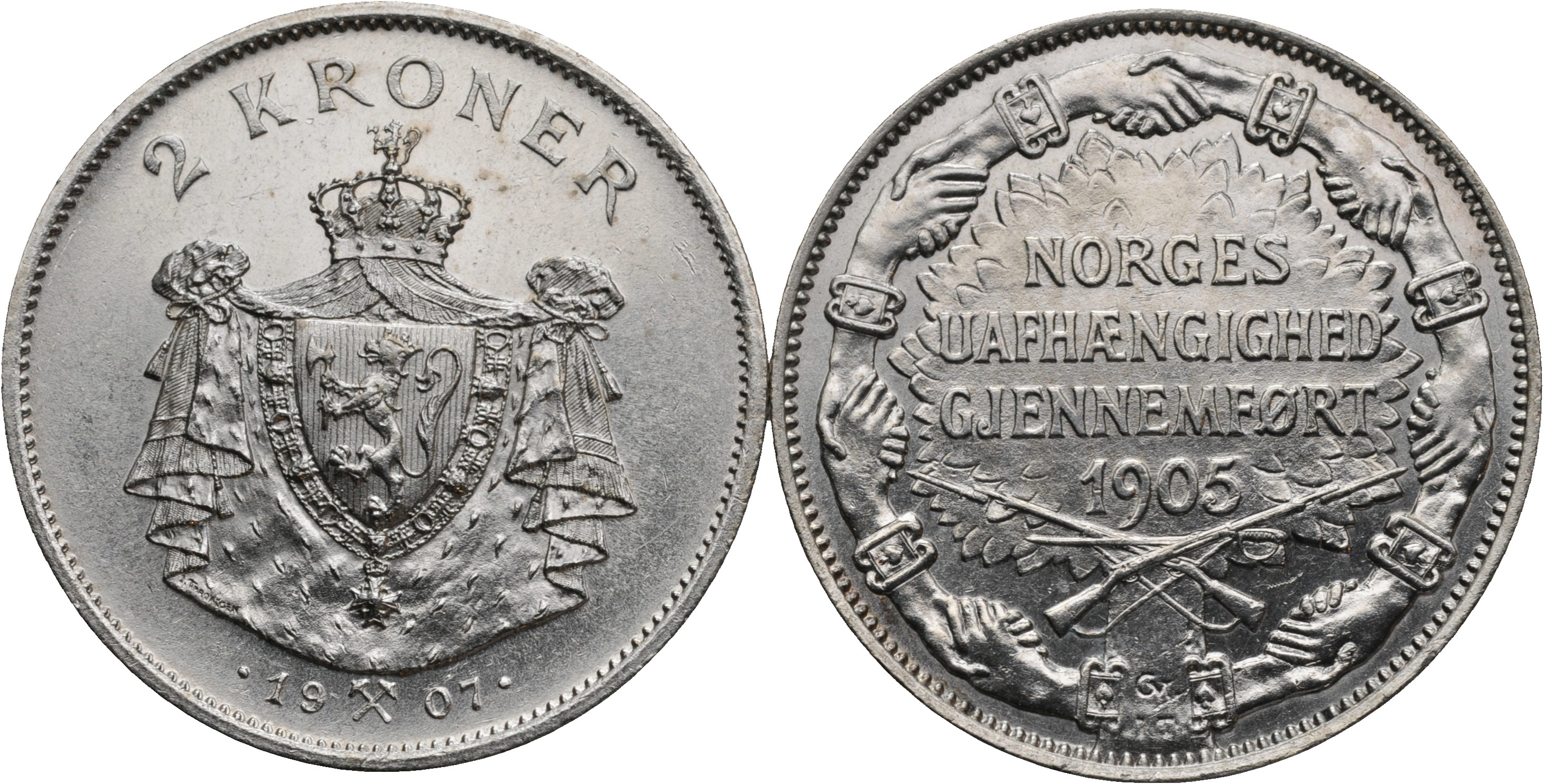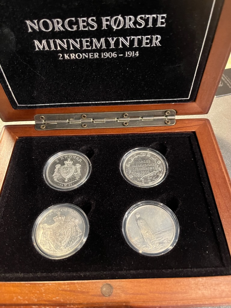 Komplett sett med 2 kroner jubileum. 4 stk. Fine kvaliteter. Fra Samlerhuset