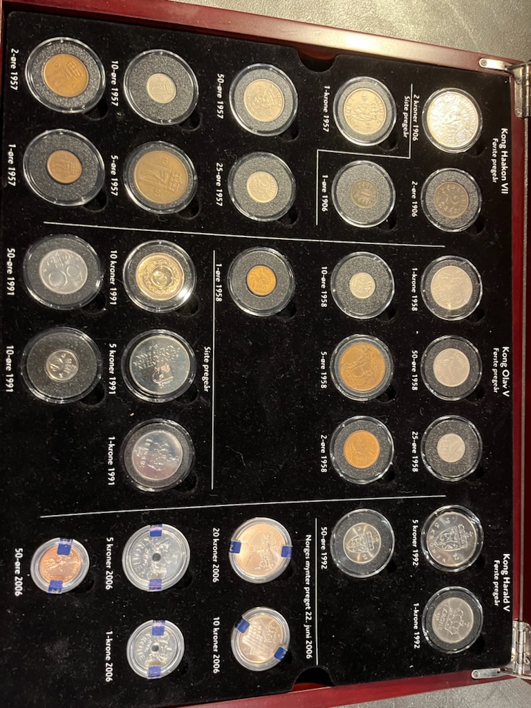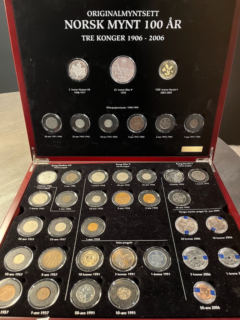 Norsk mynt 100 år med 1500 kroner i gull Tre Konger 1906 - 2006. Tot. 39 mynter inkl. 1500 i gull, 2 kroner 1906 Jub. 2 kroner 1915 og minnemynt i sølv 1970. Bare gullmynten står i 11.350 (13.mars)