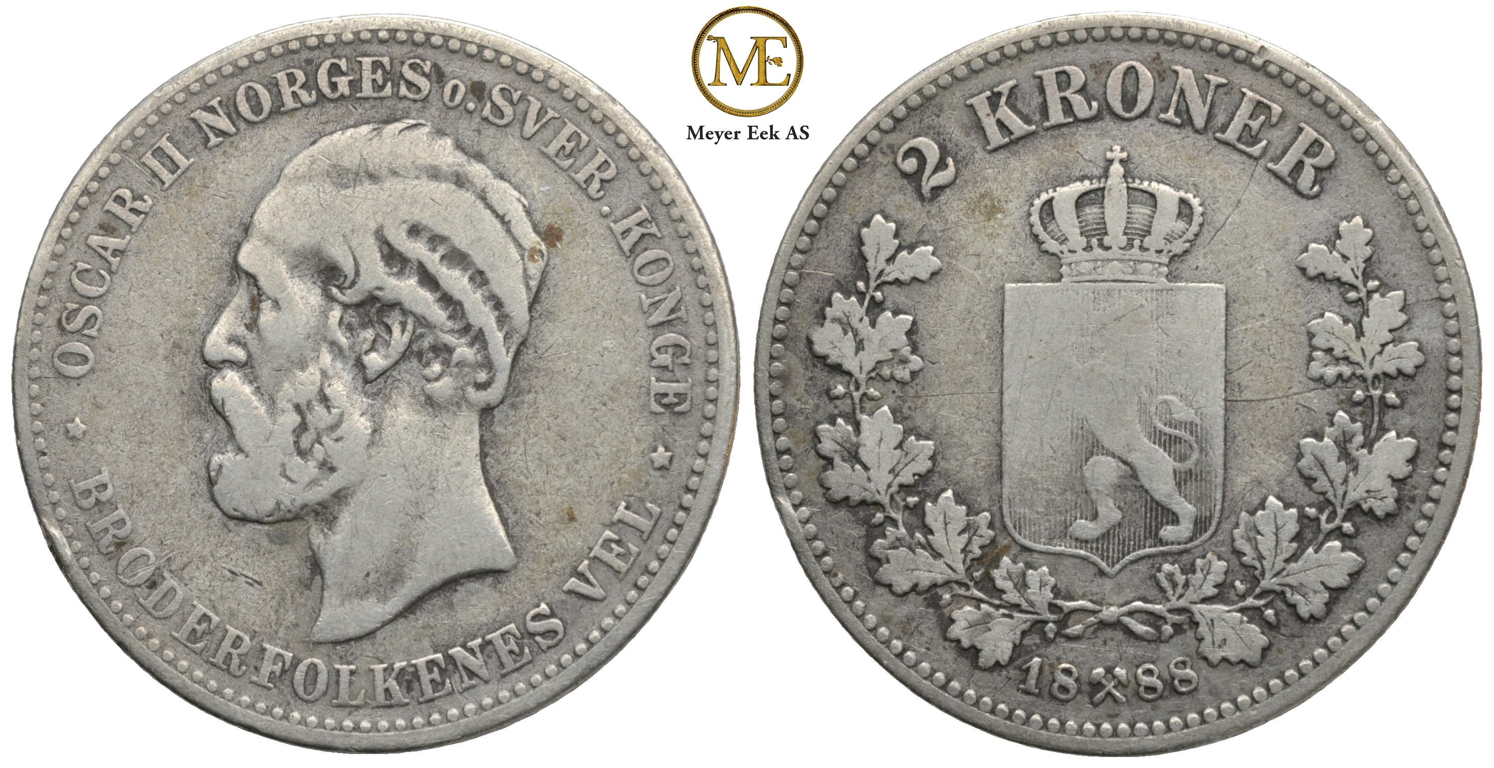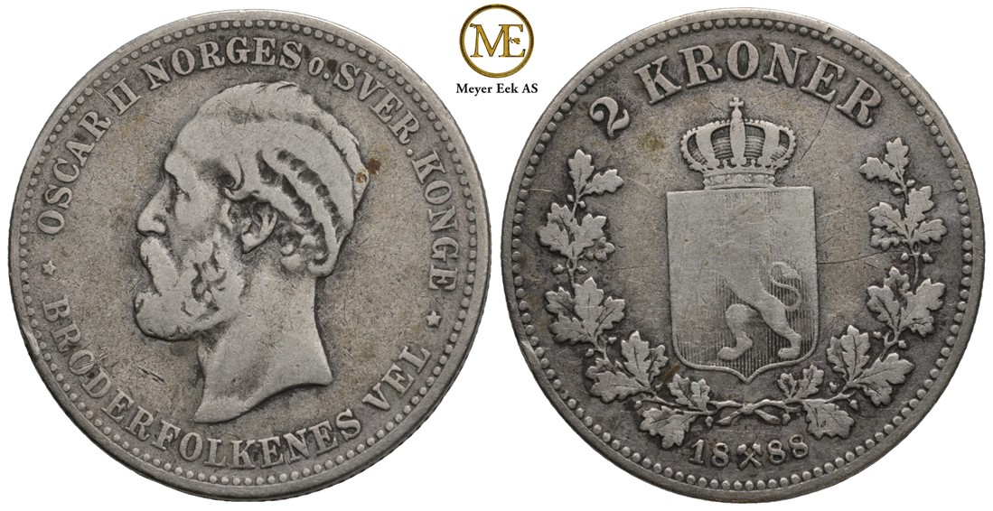 2 kroner 1888 Oscar II. Vår vanskeligste 2 krone. Kv.1/1-