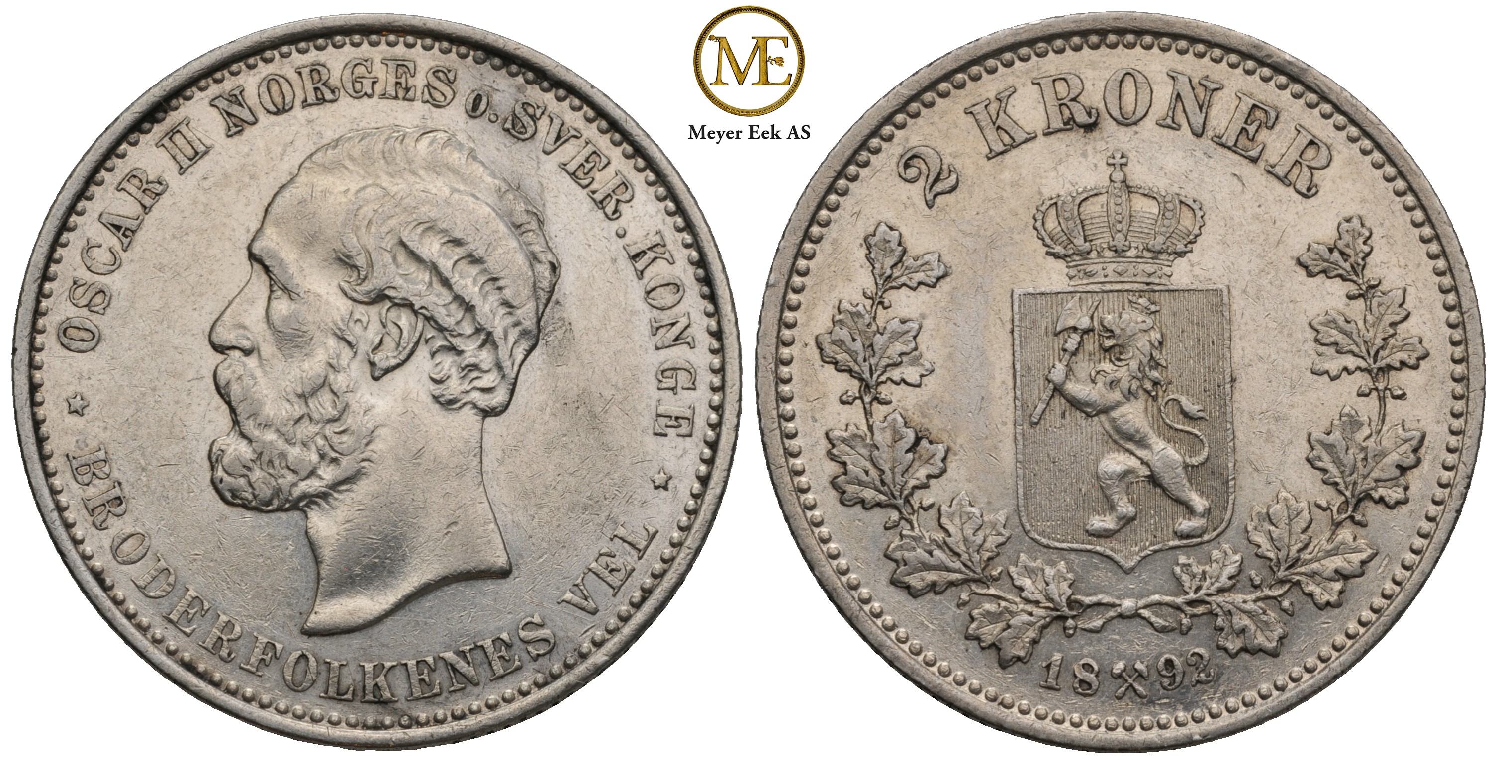 2 kroner 1892 Oscar II. Meget godt årstall. Kv.1+/01