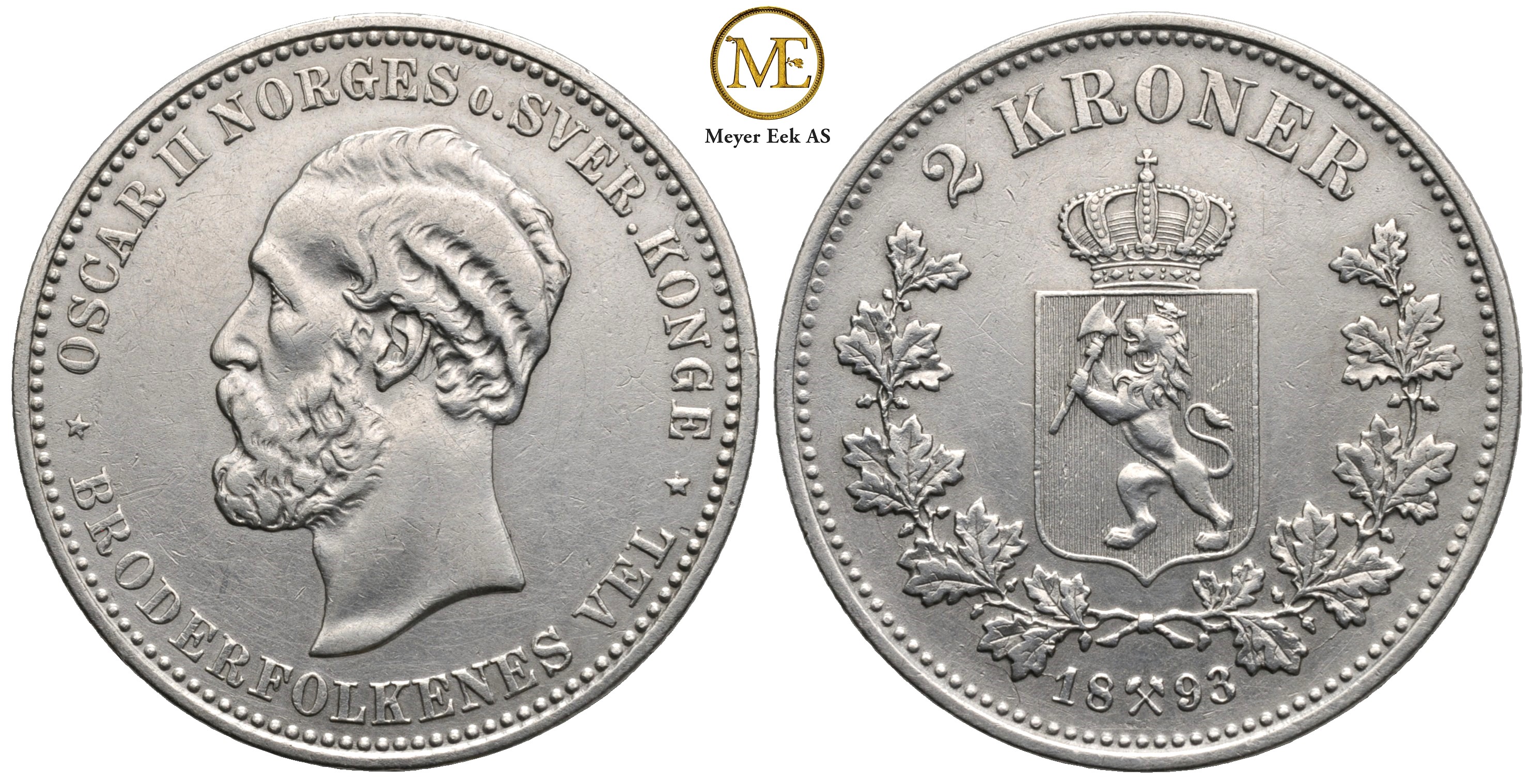 2 kroner 1893 Oscar II. Lett renset. Kv.1+/01