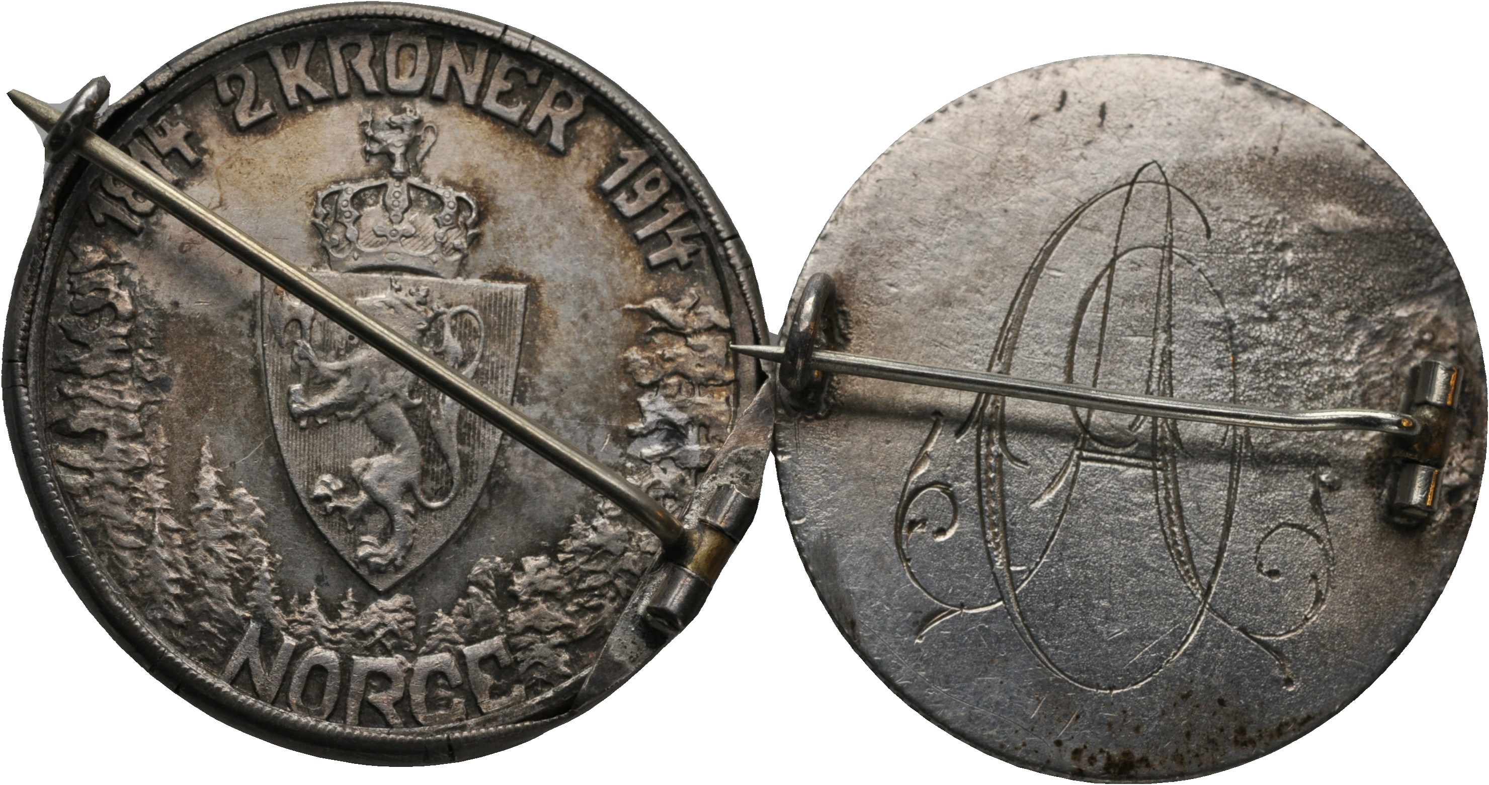 2 kroner 1907 m/gevær og Mor Norge i brosje. Mange samlere på disse