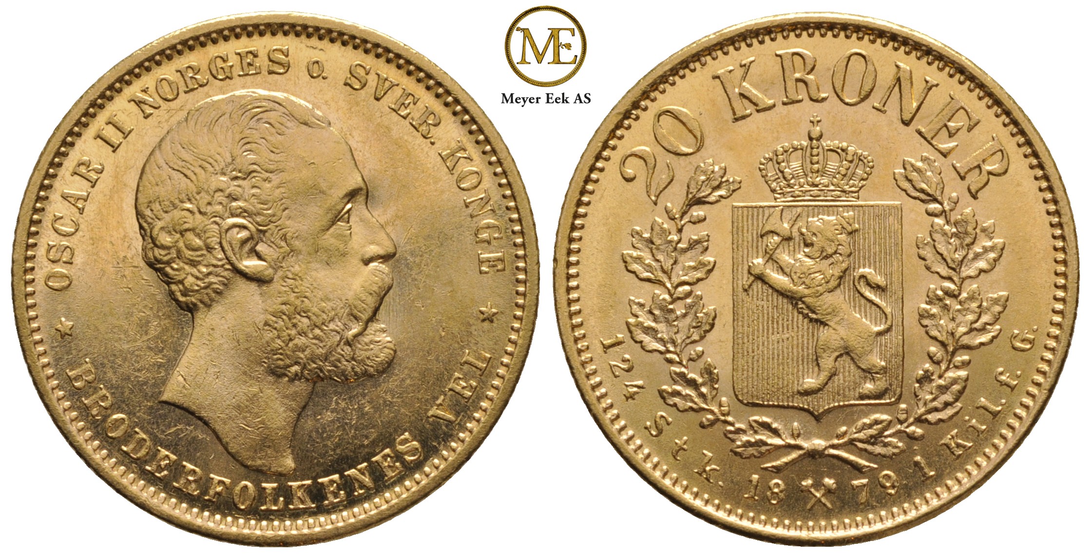 20 kroner 1879 Oscar II. Flott eksemplar. Kv.0/01