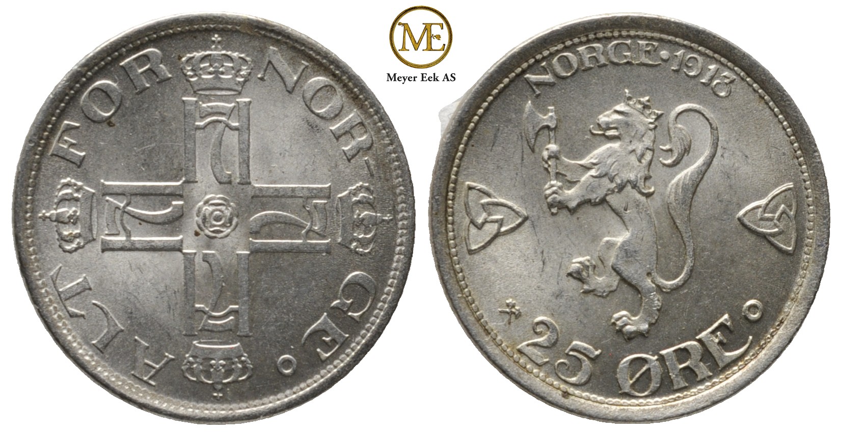 25 øre 1913 Haakon VII. Flott mynt. Kv.0