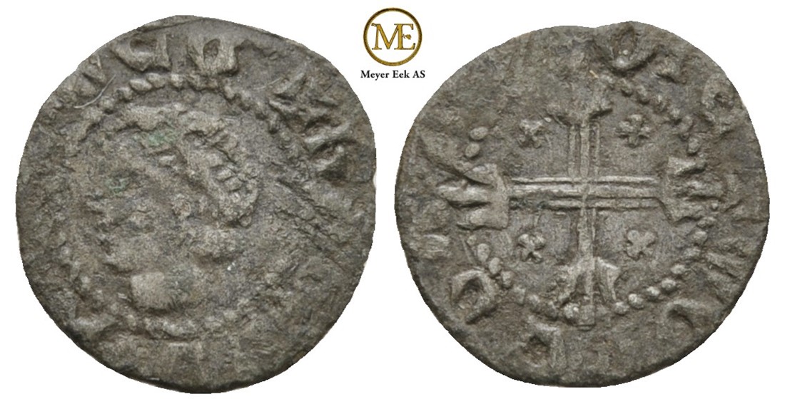 1/4 penning fra Hertug Håkon Magnusson. Fra perioden Magnusson var hertug (1280-1299) Preget i Oslo. Meget sjelden. Vekt. 0,35 gr. NM.3. Kv.1+