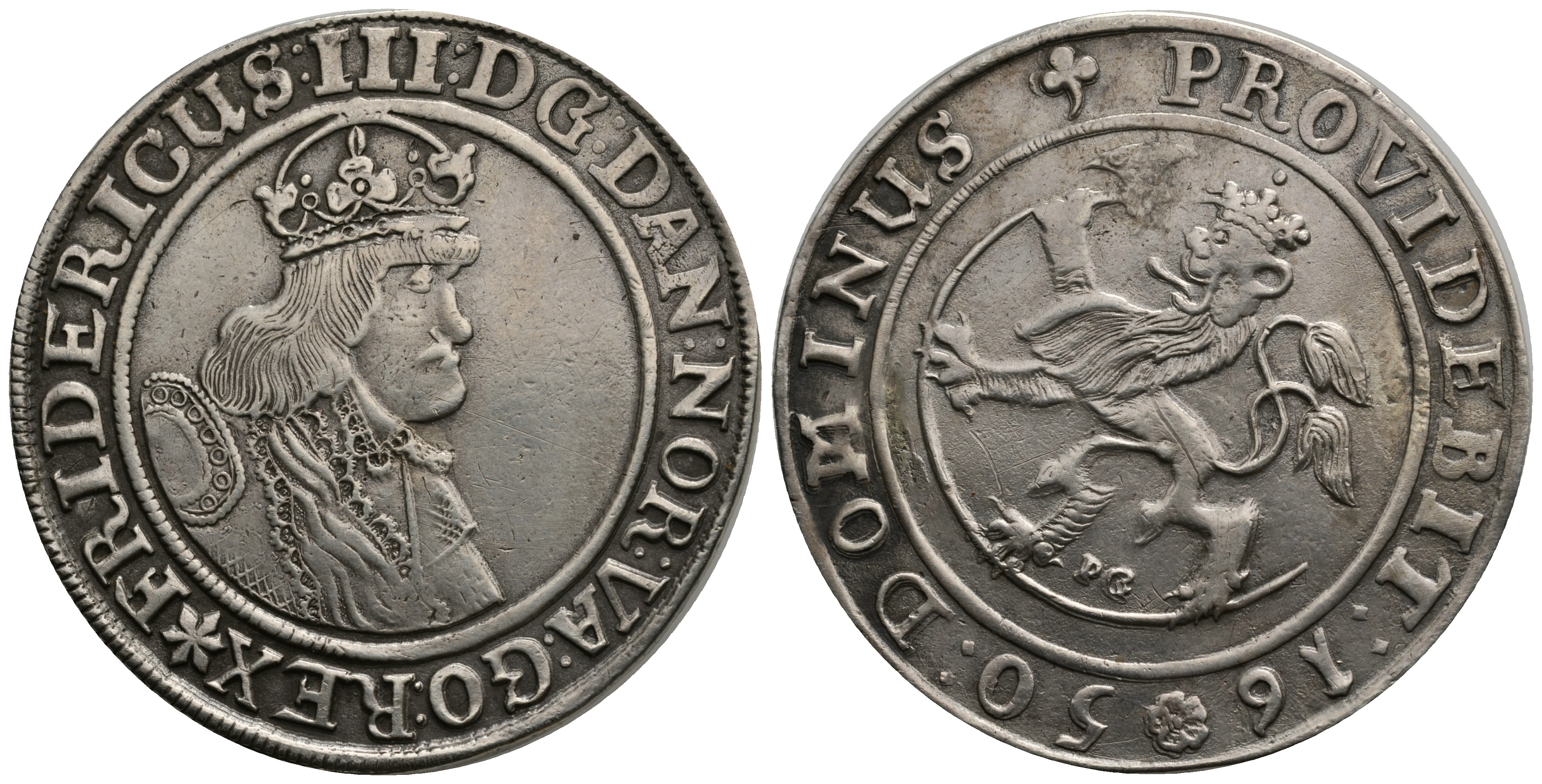 Speciedaler 1650 Frederik III. Ex. storauksjon Skanfil 2019 som 1+ og "sansynelig reparert?. S.18. Pen mynt. Kv.1+