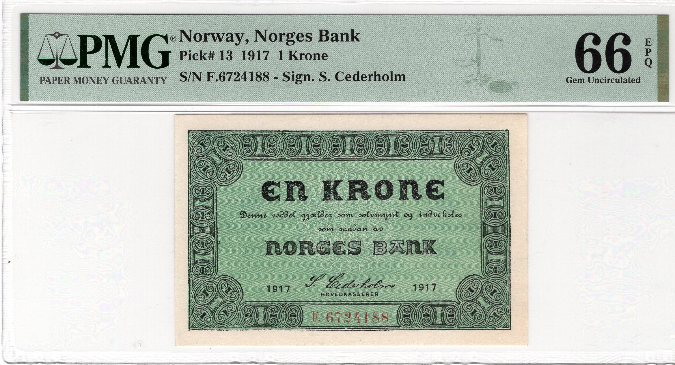 En krone 1917 F.6724288. Gradert til 66 EPQ hos PMG. Kv.0
