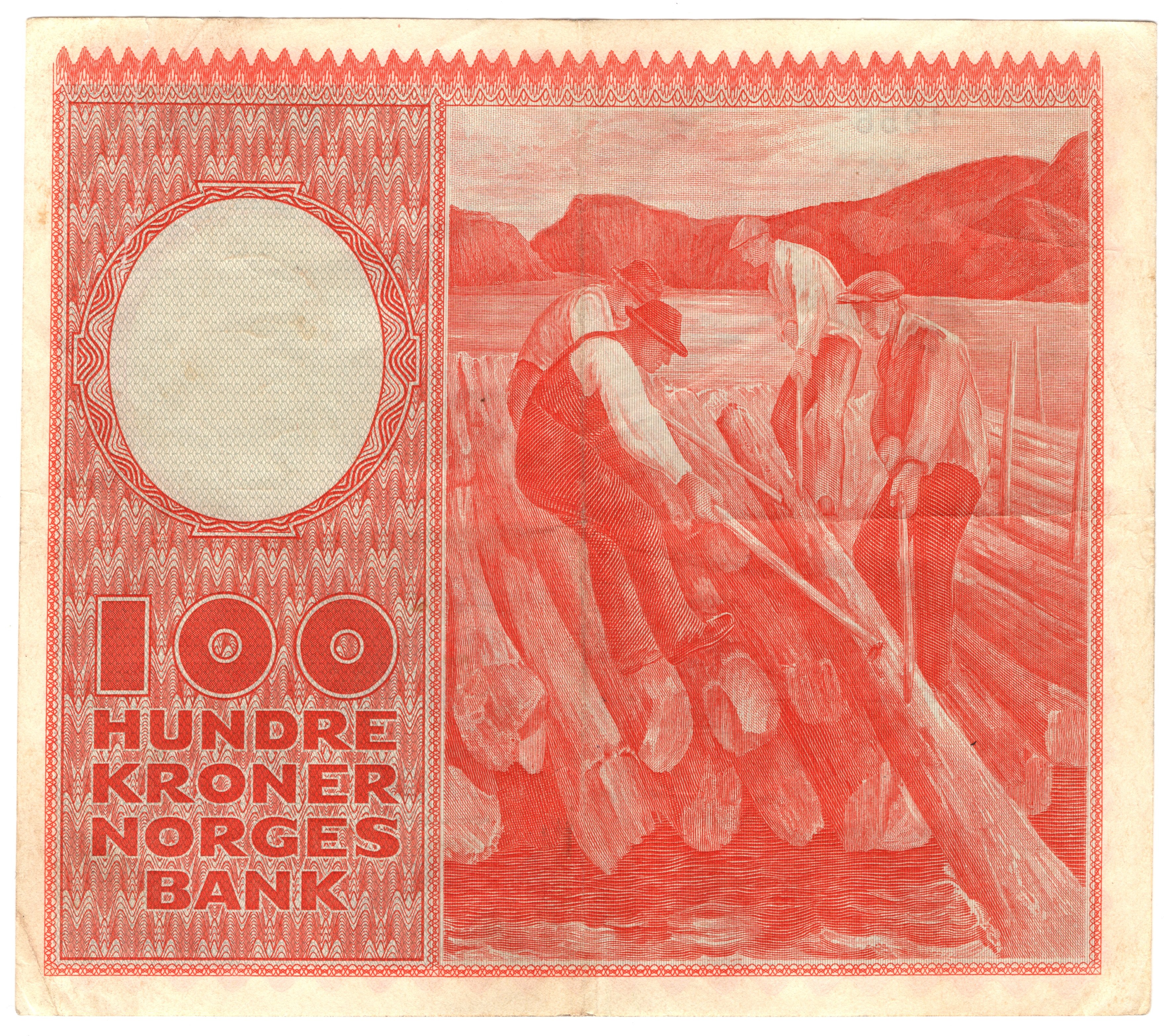 100 kroner 1956 E. Kv.1/1+5 cm. lang revne i høyre hjørne.