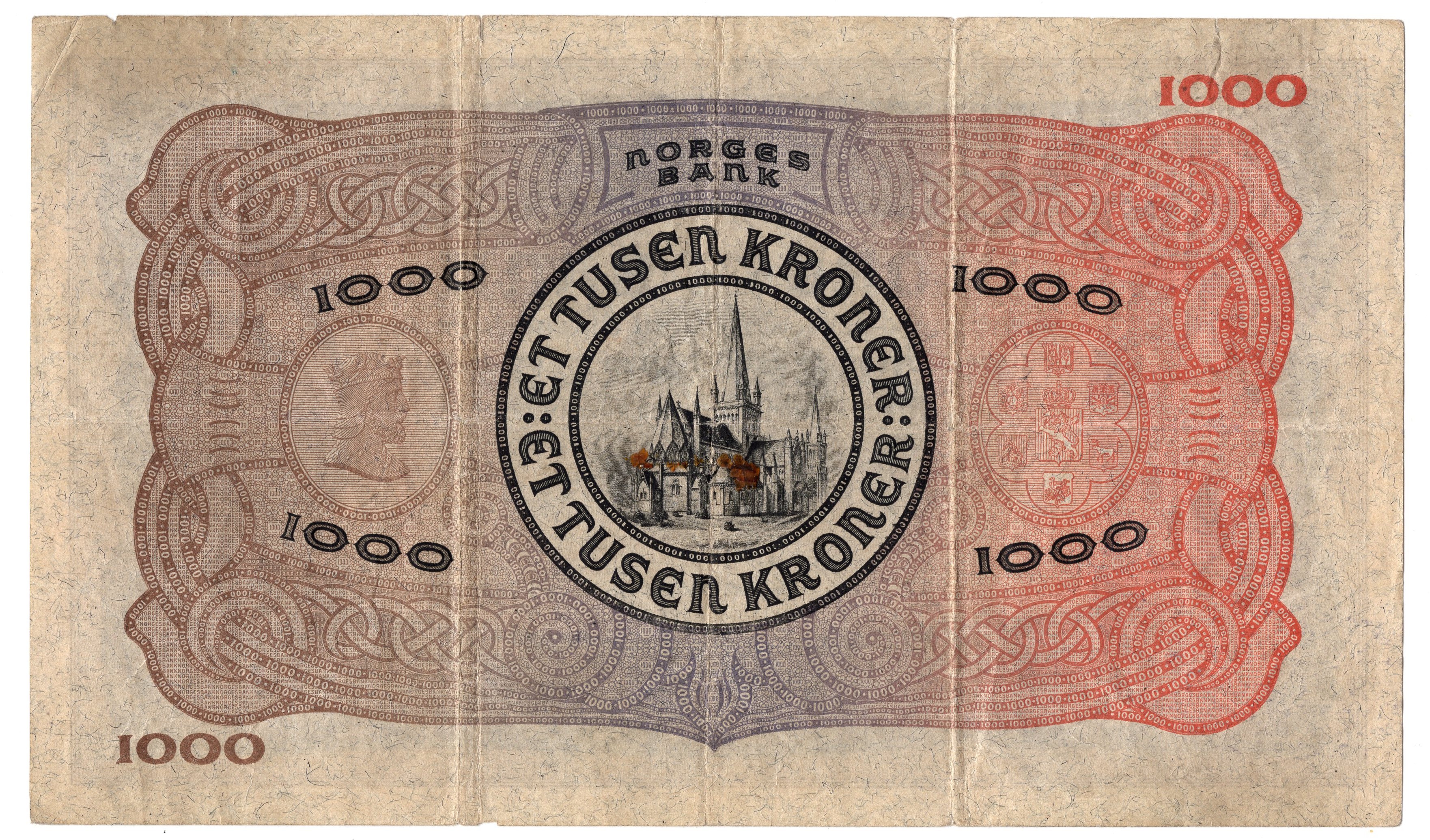 1000 kroner 1932 A.0430812. Små rifter i øvre marg. Fine farger. SS- seddel. Kv.1/1-