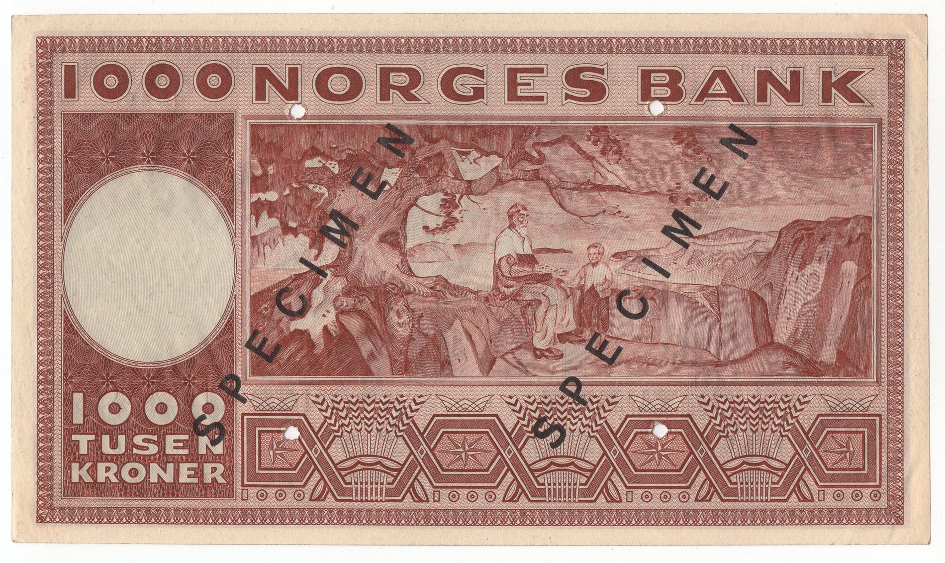1000 kroner 1949 X.0000000. Specimen. Svake bøyninger til venstre opp og nede. Sjelden seddel. Kv.0/01
