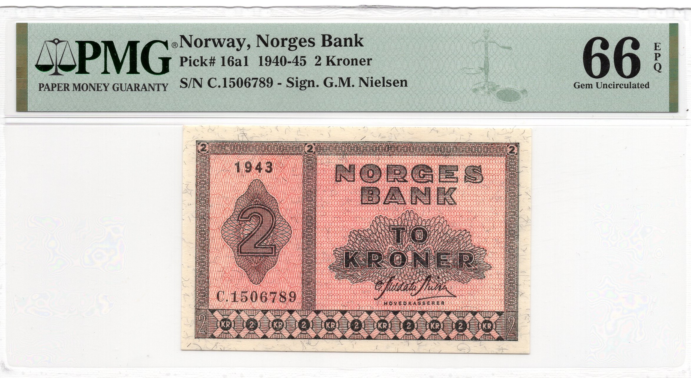 2 kroner 1943 C.1506789. Gradert til 66 EPQ hos PMG. Kv.0